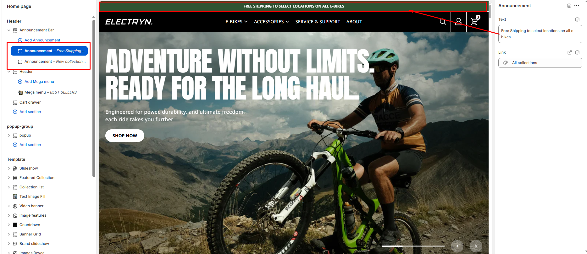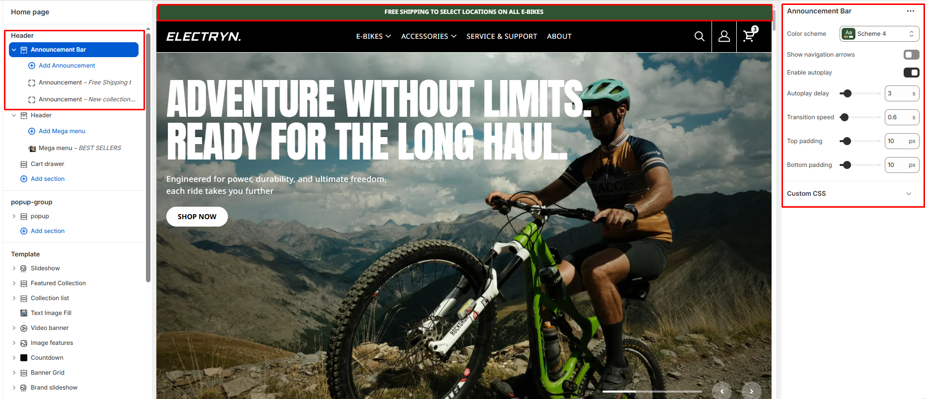 The Announcement Bar section allows you to display rotating or static messages at the top of your store. This is useful for sharing important announcements, promotions, shipping updates, or seasonal messages.