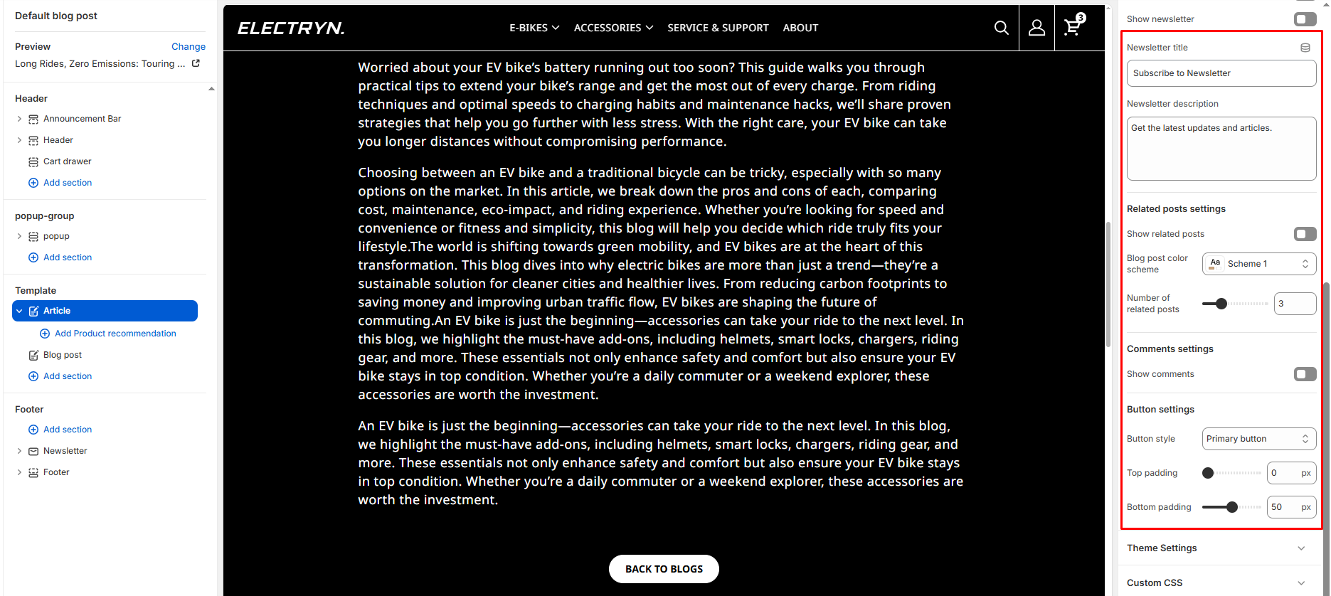 - Show back to blog: Shows the back to blog button.