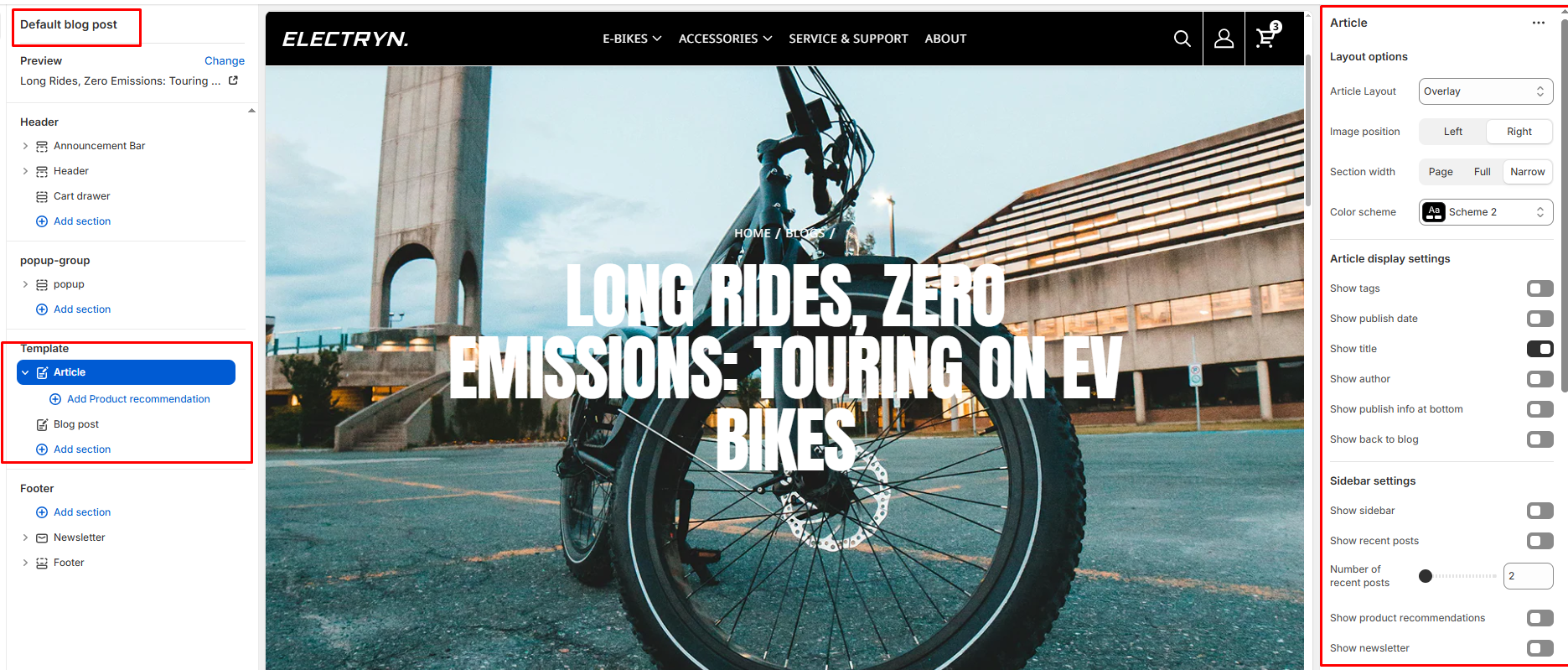 The Article section is used to display detailed blog post content with optional related posts, author metadata, and comments.