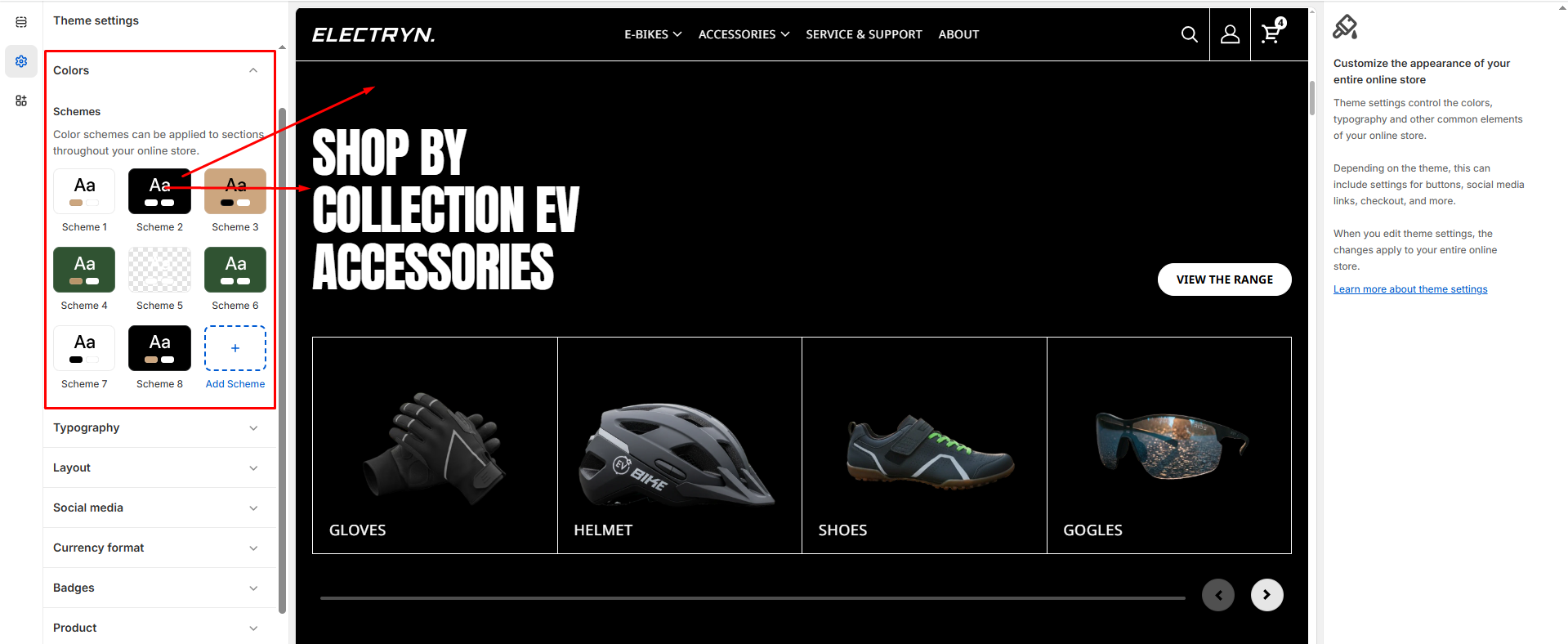 You can create different sets of colors called color schemes. Electryn Theme provides 8 default color schemes, and supports up to 21 color schemes for your store. Refer to Shopify help: Color schemes.