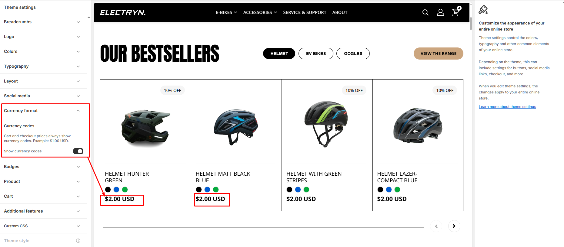 Our theme supports Shopify’s multi-currency. Select/deselect to show/hide the currency.