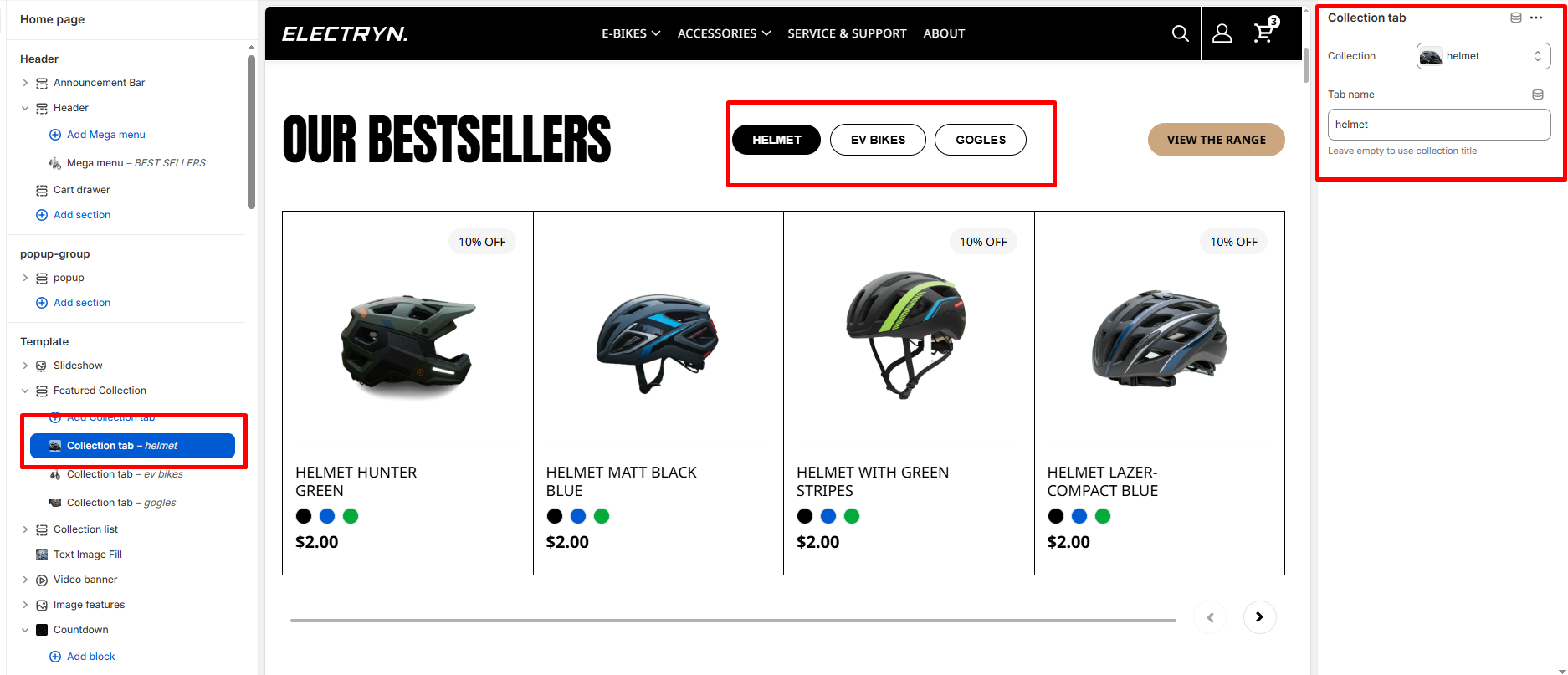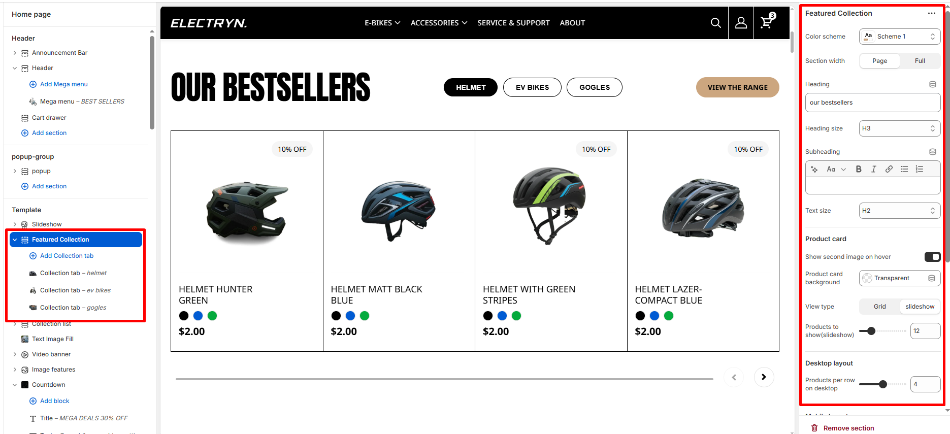 The Featured Collection section allows you to highlight products from one or more collections directly on your homepage. It supports toggling between collections, customizing the display layout, and configuring product card options.