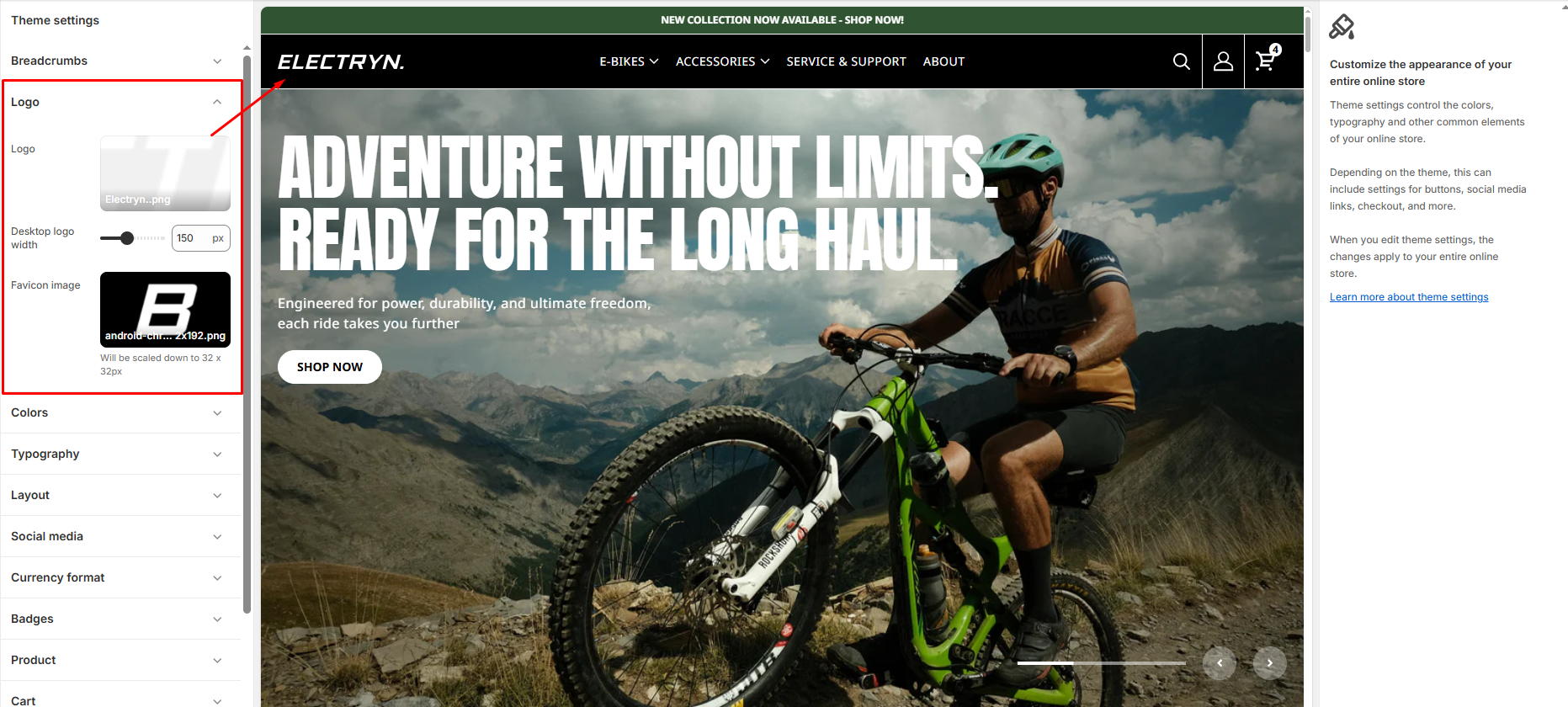 The logo is an essential part of your brand identity and can be customized in size, position, and style to fit the overall design of your store. Your logo appears in the header on all pages and on the password page.