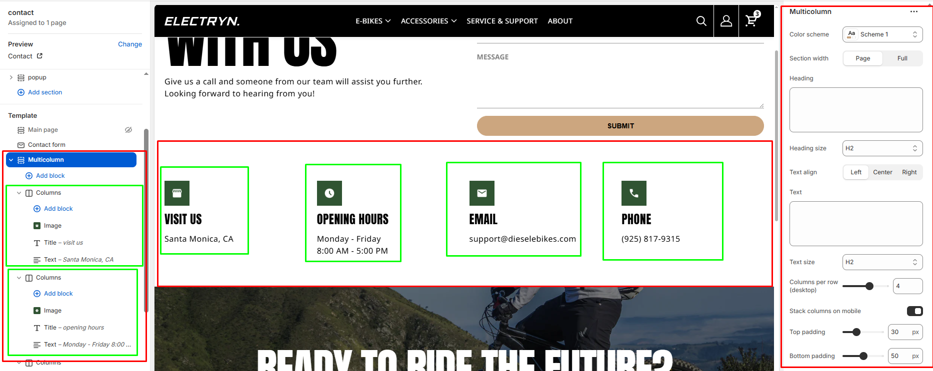 The Multicolumn section allows you to display multiple columns of content (such as features, stats, or highlights) in a grid layout. Each column is added and managed as a Theme block within the section.