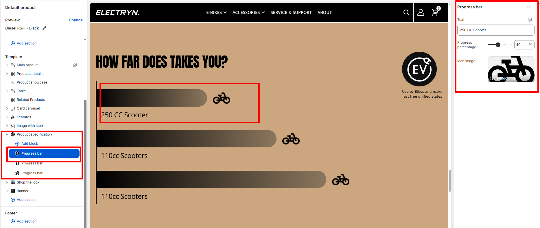 A Product Specification section displays comparative progress bars to visualize and compare different product specifications, performance metrics, or features. This section is ideal for showcasing range comparisons, performance data, or any metric-based product information with an eye-catching animated progress bar design. Each bar includes customizable labels, icons, and percentage values.