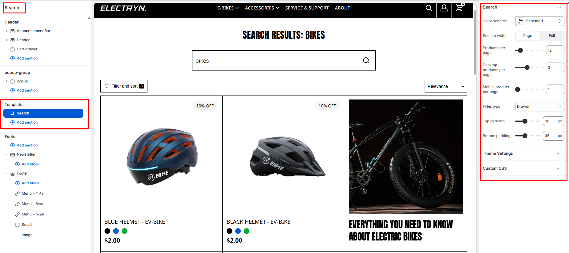 The search page is the page that displays the search bar and relevant results after a customer uses your store’s search function. It allows your customers to easily find specific products, collections, or information on your website.