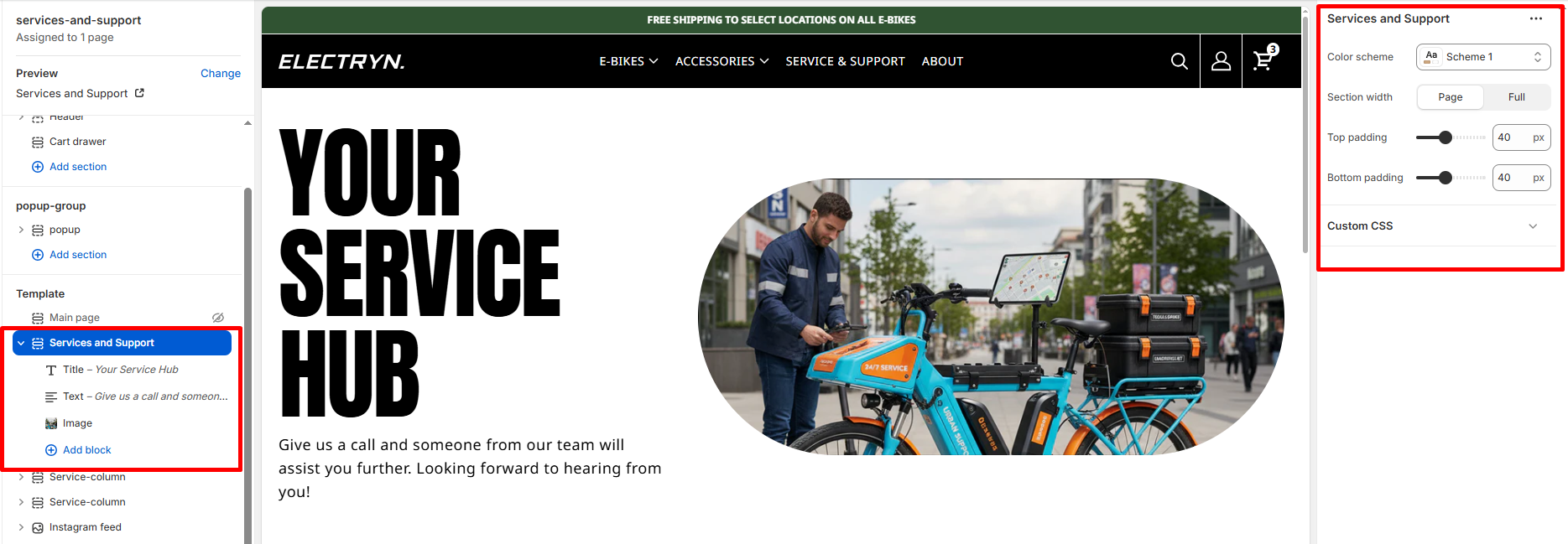 A Services And Support section creates a dedicated page or area to showcase your service offerings with a prominent hero image and service categories. This template-based section is ideal for presenting customer support, service hubs, or help centers with a professional layout that combines compelling visuals with organized service information.